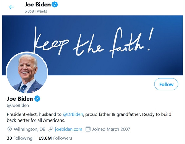 Ngược lại, tài khoản Twitter của ông Joe Biden đang tiến lên nhanh chóng, mặc dù con số 19,8 triệu người theo dõi ông vẫn là rất thấp so với hơn 88 triệu người theo dõi Tổng thống Trump. Nhưng theo Social Blade thì chỉ trong ngày 25/11, tài khoản của ông Biden đã có thêm hơn 130.000 người theo dõi.