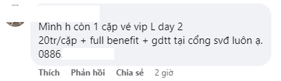 Ngoài ra, một số người bán sẽ giảm giá vé VIP xuống khoảng 1 triệu vì không bao gồm set quà độc quyền. Trong khi set quà độc quyền đang được bán lại (gồm 8 thẻ bo góc, thẻ cứng đeo, mũ...) với giá từ 1,5 đến 2 triệu đồng.