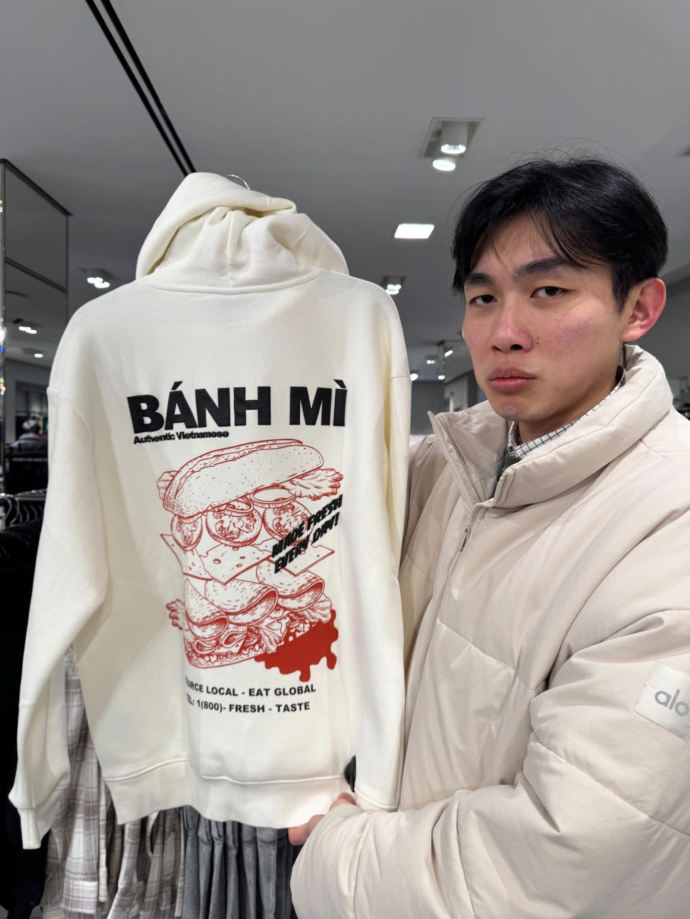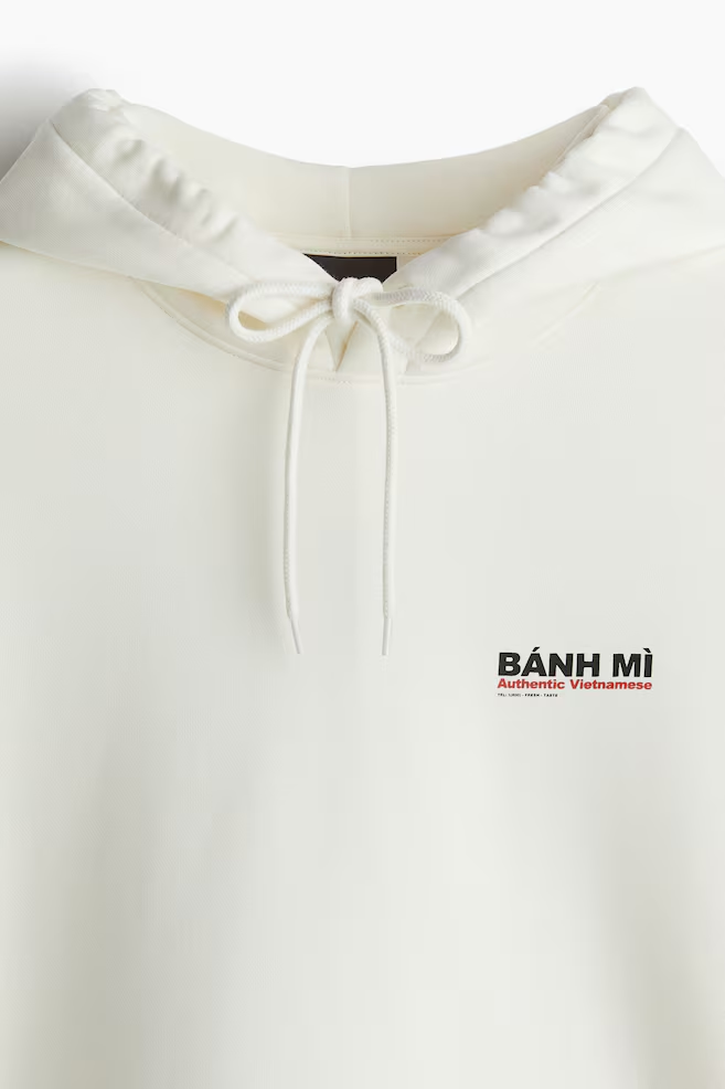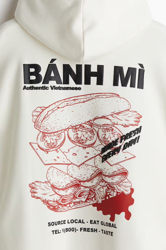 Thương hiệu thời trang nhanh đến từ Thụy Điển - H&M mới đây bày bán sản phẩm thiết kế trang phục được cho là lấy cảm hứng từ món ăn đường phố Việt Nam. Thiết kế áo hoodie có một phiên bản màu trắng, được bán với giá 229 đô la Hồng Kông (hơn 750 nghìn đồng).