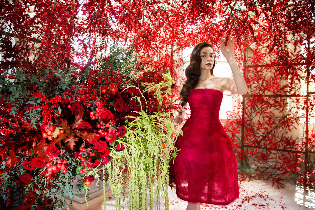 Hồ Ngọc Hà diện trang phục của nhà mốt Oscar de la Renta, dạo chơi trong khu vườn hoa rực rỡ.