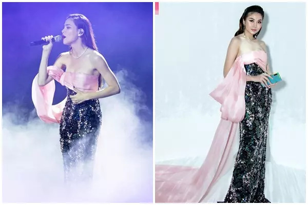 Thanh Hằng "đụng độ" Hồ Ngọc Hà trong cùng một bộ đầm dạ hội, cả hai đều làm kiểu tóc xõa gọn gàng kiêu sa làm lộ ra bờ vai trần quyến rũ.