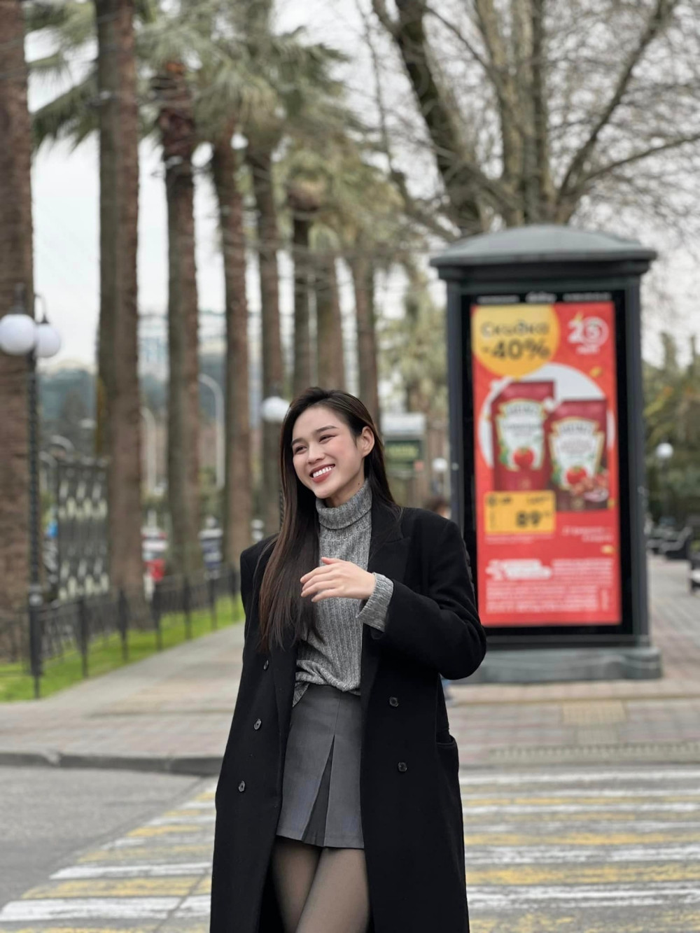 Nàng hậu nổi bật giữa khung cảnh của nước bạn, cho dù mặc đồ gam màu tối. Phong cách này của Hoa hậu Đỗ Thị Hà được khen trẻ trung, khỏe khoắn.