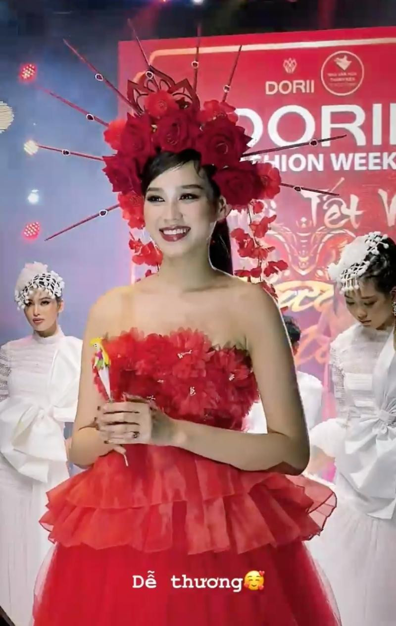 Hoa hậu Đỗ Thị Hà mặc bộ váy đỏ rực, đội chiếc mấn hoa hồng, được netizen nhận xét xinh đẹp như nàng tiên mùa Xuân. Sau khi trải qua thời gian tham gia Miss World 2021, Hoa hậu Đỗ Thị Hà đã gần như “lột xác”, cô bước đi trên sàn catwalk cực kỳ tự tin, thần thái chuyên nghiệp. Đến cuối màn diễn, cô còn được một fan nhí tặng cho món quà là hình tò he Thủy thủ Mặt Trăng, khiến người đẹp vô cùng thích thú.