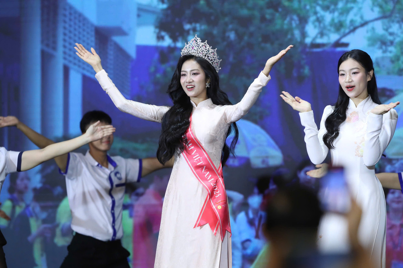 | Hoa hậu Hà Trúc Linh và top 15 Hoa hậu Việt Nam 2024 Trần Thị Huyền Cơ nhảy cùng sinh viên trong lần trở về trường đầy xúc động. |