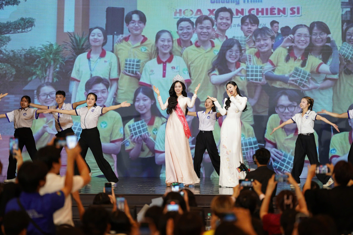 Khi âm nhạc vang lên, không ai nghĩ Hoa hậu Việt Nam lại có thể "cháy" hết mình như vậy. Vừa cười rạng rỡ, vừa thuộc lời, Trúc Linh không ngần ngại hòa nhịp cùng sinh viên, thậm chí còn tự tin thể hiện những động tác vũ đạo cực sung. Cả hội trường gần như “vỡ òa” trước sự gần gũi, dễ thương và năng lượng tích cực mà cô mang đến.