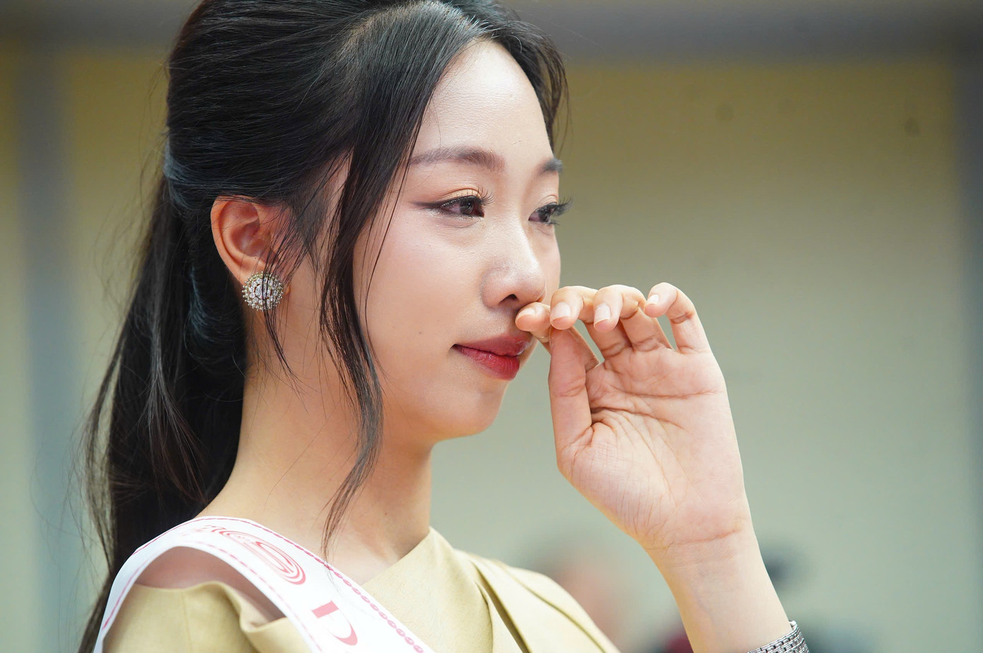 Người đẹp Phạm Thùy Dương - Đại sứ Du lịch và Môi trường - cũng không kìm được nước mắt khi lắng nghe chia sẻ từ các cán bộ Tiền Phong, những người lặng thầm đồng hành cùng các thí sinh trong suốt cuộc thi.