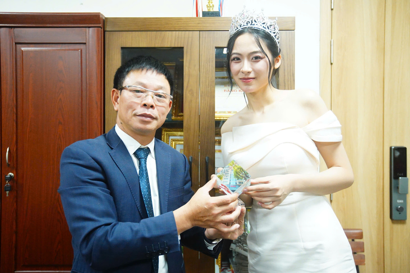 | Tổng Biên tập Phùng Công Sưởng dẫn top 5 Hoa hậu Việt Nam 2024 tham quan phòng truyền thống của báo Tiền Phong. |