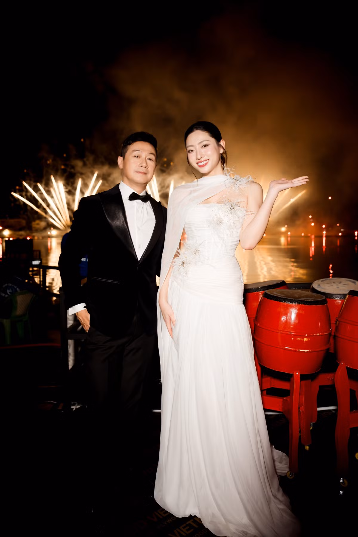 Cũng trong đêm khai mạc, Lương Thuỳ Linh diện thiết kế màu trắng vô cùng lộng lẫy đến từ NTK Đỗ Long, được biết chiếc váy được NTK Đỗ Long ráo riết làm riêng cho nàng hậu trong thời gian ngắn để kịp cho đêm khai mạc Lễ hội.