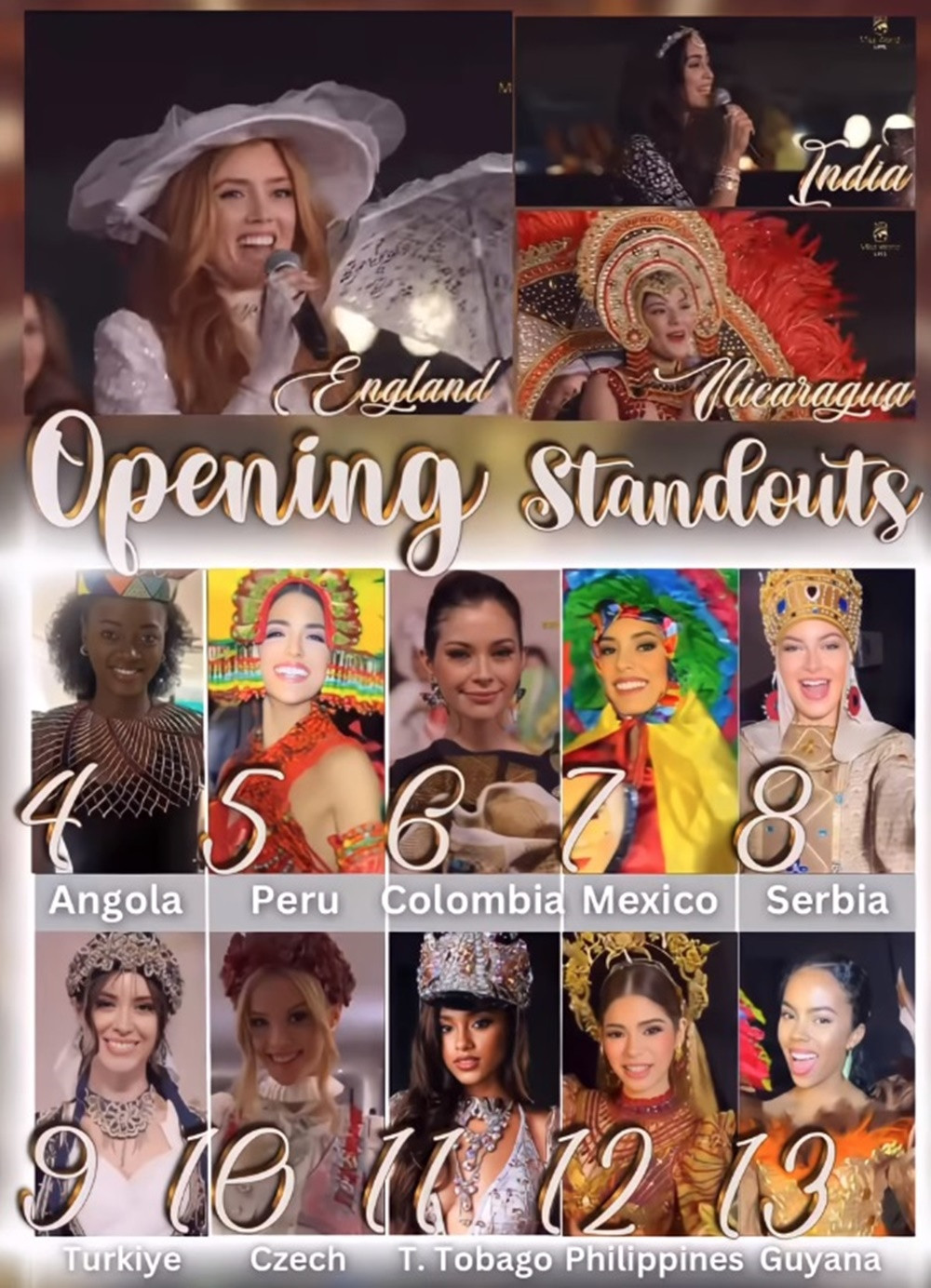 Một chuyên trang khác nhỏ hơn là @official_bpageantcorner xếp Mai Phương nằm trong Top 30 thí sinh có màn thể hiện tốt nhất tại lễ khai mạc (ngoài Top 5, các thí sinh còn lại được xếp ngẫu nhiên, không theo thứ tự nào).