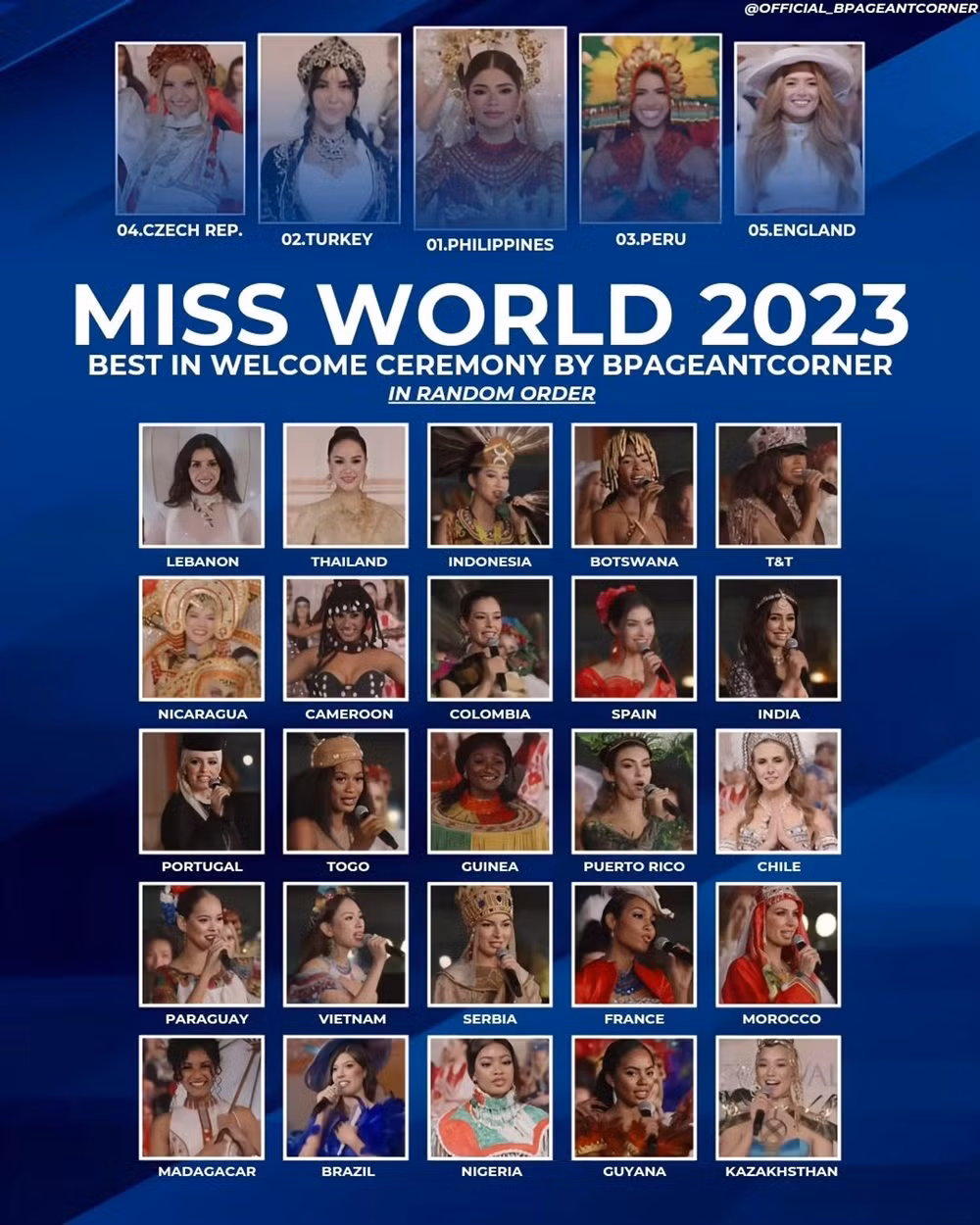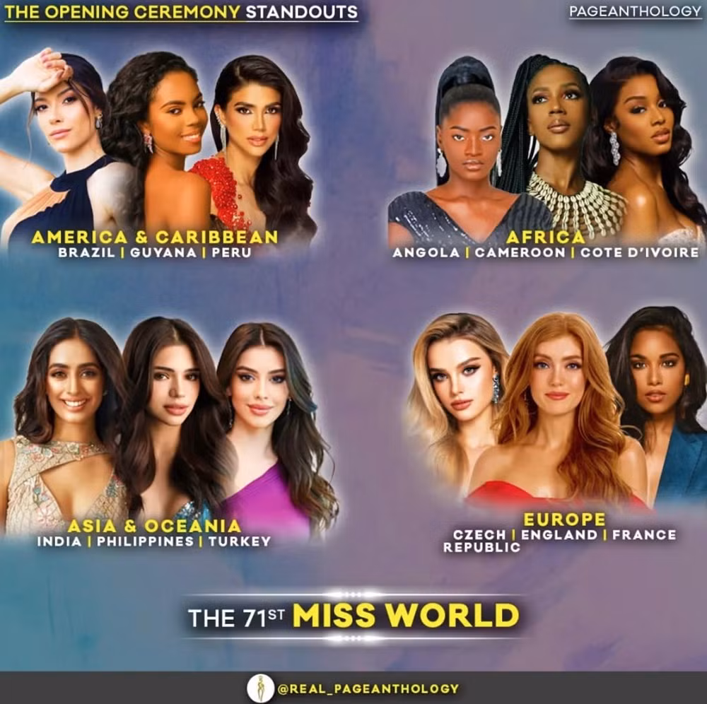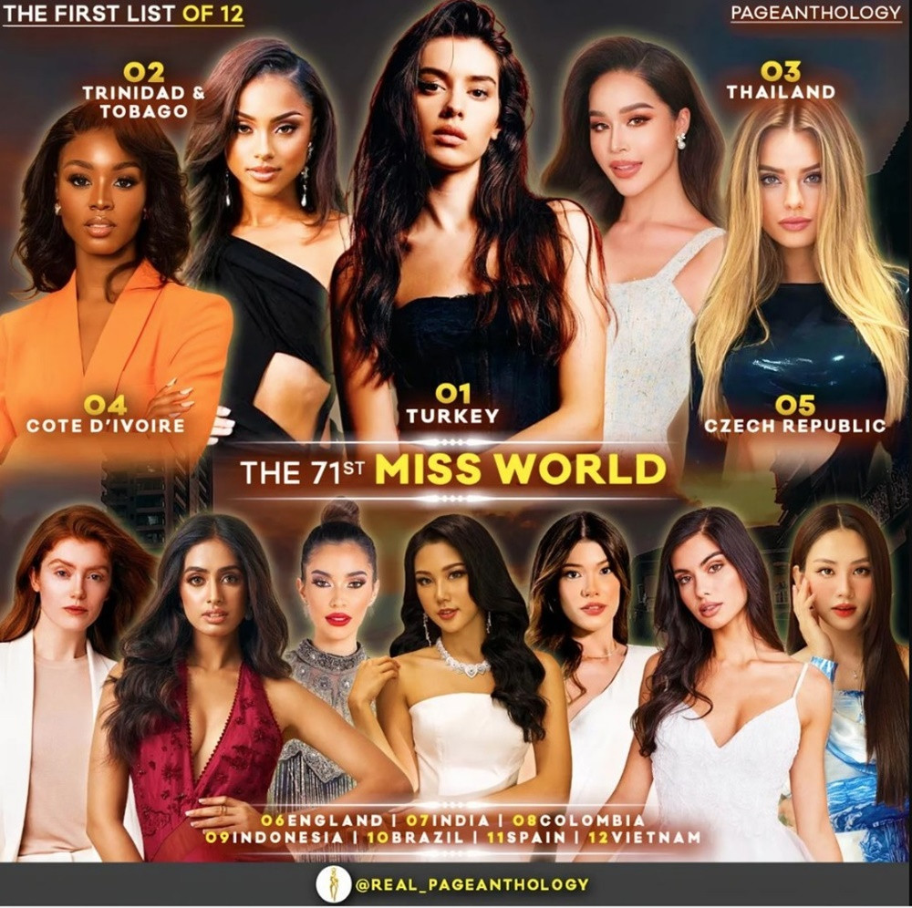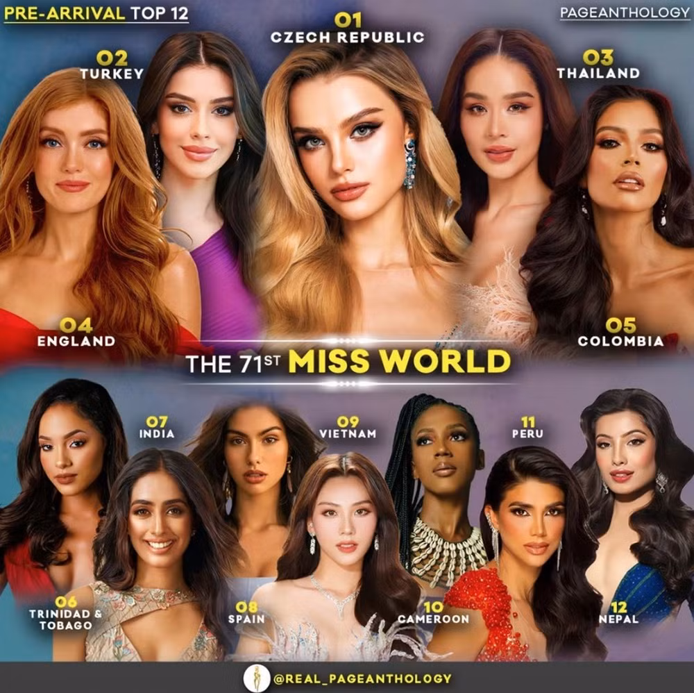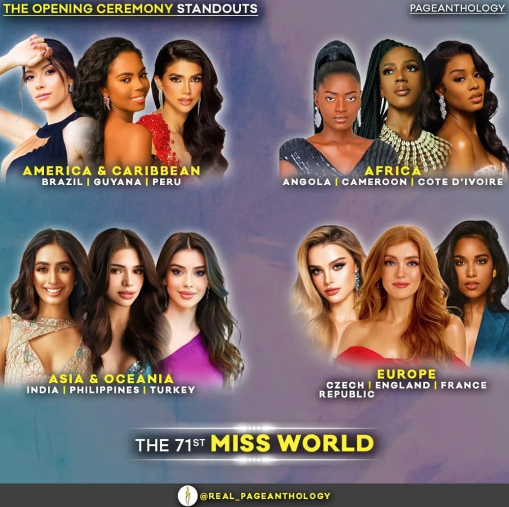 Một trong những chuyên trang nhan sắc có số lượt người theo dõi vô cùng đông đảo (483K lượt) là @real_pageanthology có BXH đánh giá sớm nhất. Các thí sinh của Miss World lần thứ 71 được giới thiệu tại Lễ Khai mạc theo khu vực: Châu Mỹ và Ca-ri-bê, châu Phi, châu Á và châu Đại Dương, châu Âu. Vì thế, chuyên trang này cũng chọn ra Top 12 thí sinh chia đều theo các khu vực này.