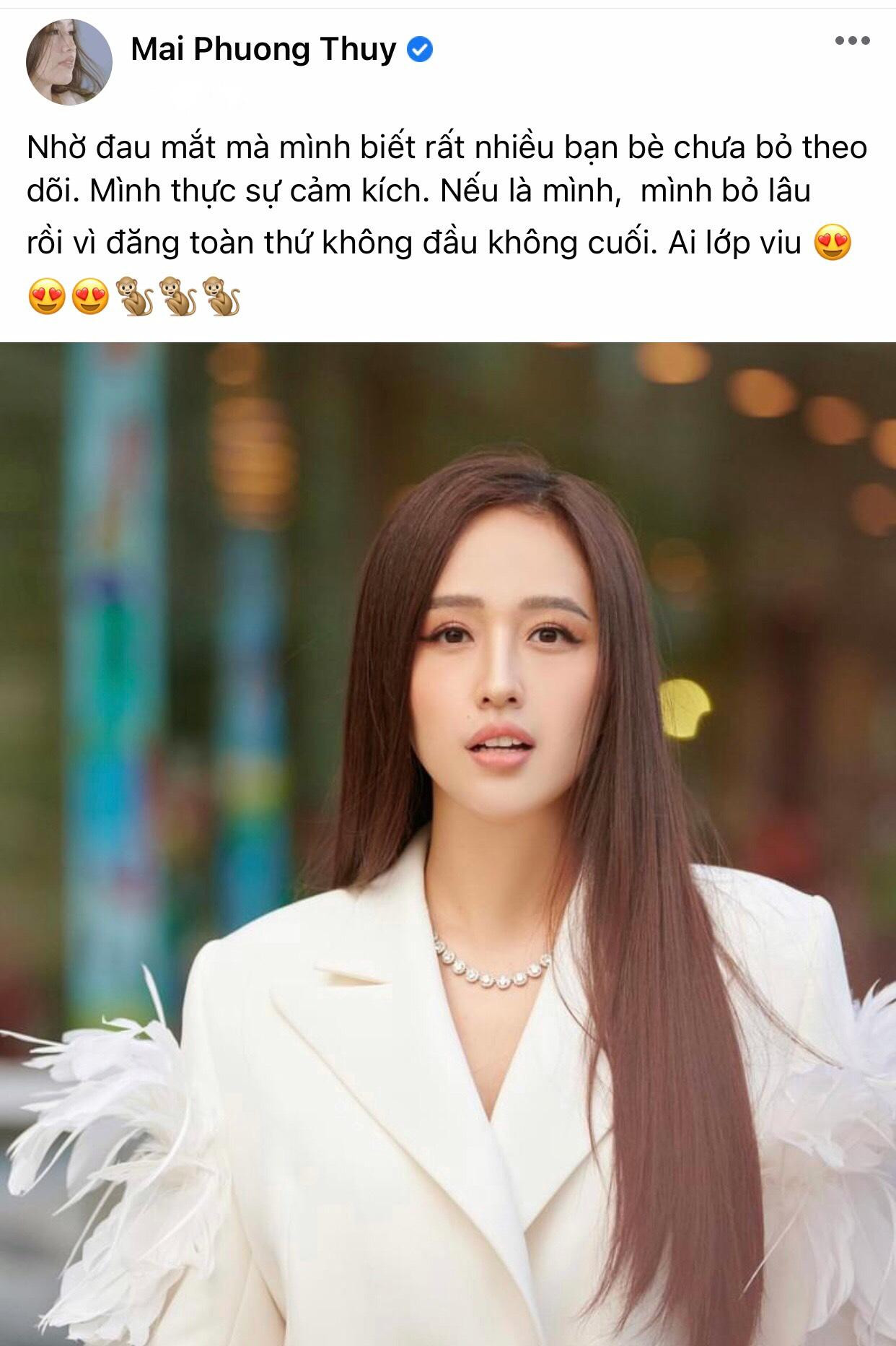 Trước sự quan tâm của mọi người, nàng hậu cảm động viết: "Nhờ đau mắt mà mình biết rất nhiều bạn bè chưa bỏ theo dõi. Mình thực sự cảm kích. Nếu là mình, mình bỏ lâu rồi vì đăng toàn những thứ không đầu không cuối".