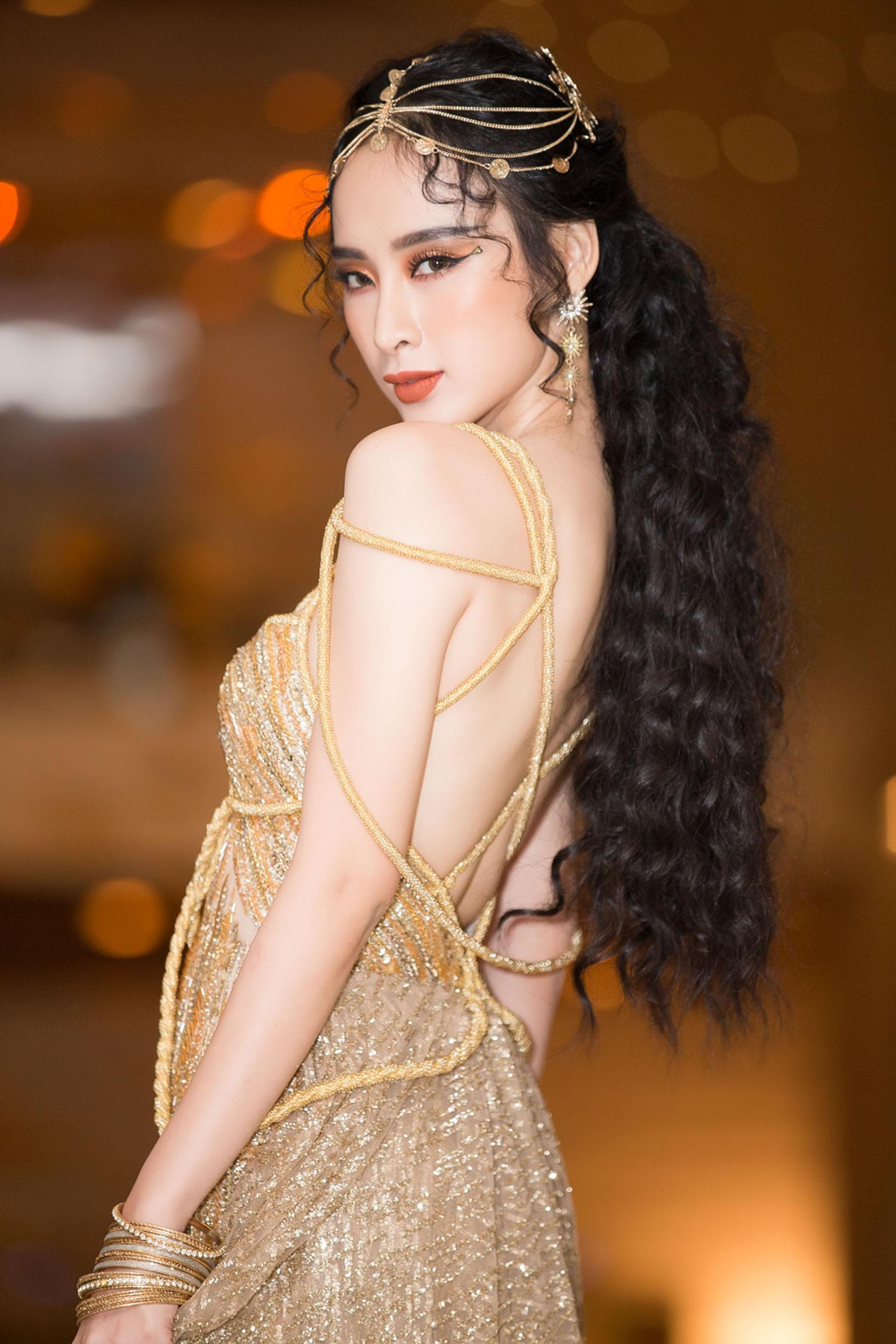 Angela Phương Trinh được đánh giá là người đẹp theo phong cách "Nữ hoàng Ai Cập" thành công nhất. Mỹ nhân 9X gây ấn tượng bằng phong cách catwoman với mái tóc xoăn dài và trang phục được cắt xẻ táo bạo. Bên cạnh đó, cách phối trang sức như vòng đính tóc, bông tai, vòng tay cũng giúp Angela Phương Trinh chiếm spotlight bởi vẻ ngoài rạng rỡ, quyến rũ.