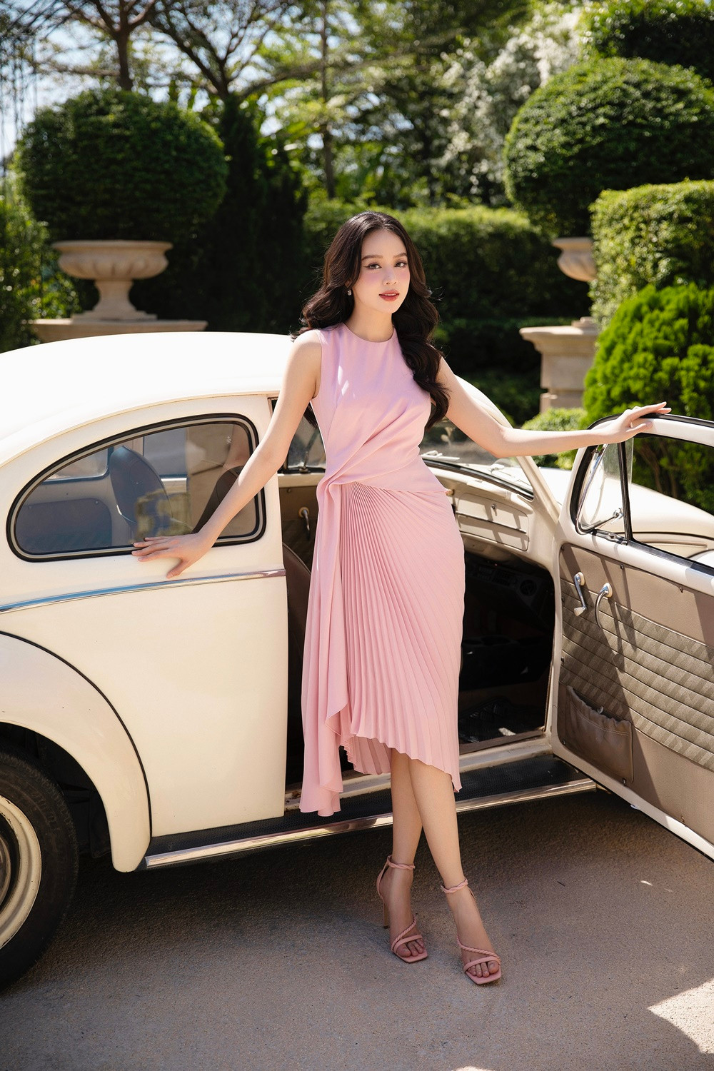 Thiết kế với phần chân váy dạng bút chì phá cách, chi tiết draping bất đối xứng, xếp pli giúp người mặc che khuyết điểm vòng eo và hông.