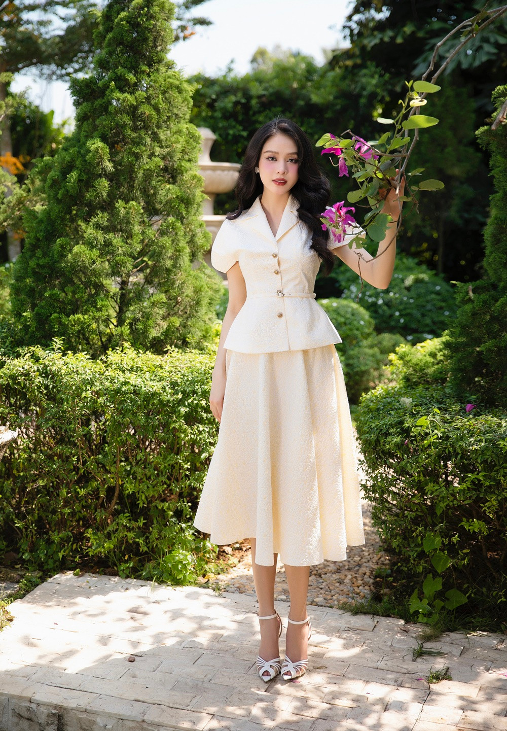 Nhà thiết kế sử dụng các chất liệu cao cấp như crepe, tulle, lace kết hợp cùng các kỹ thuật draping, smocking, thêu thủ công trên những phom dáng cơ bản như bút chì, váy chữ A, váy xòe.
