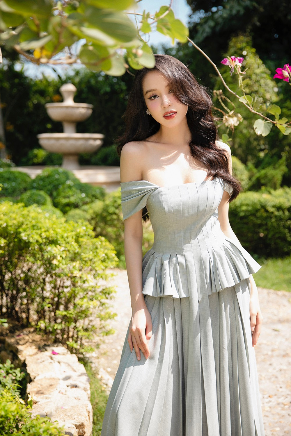 Mang đến sự mới mẻ cho những thiết kế, NTK Lê Thanh Hoà đã biến tấu chiếc váy đơn điệu với kỹ thuật smocking kết hợp dập pli tạo hiệu ứng bắt mắt.