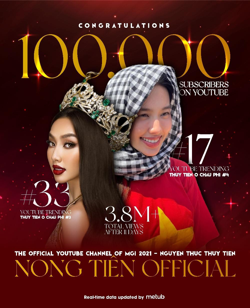 Chỉ sau đúng 11 ngày kể từ khi đăng video đầu tiên, Hoa hậu Hòa Bình Quốc tế (Miss Grand International) 2021 đã đạt được nút Bạc YouTube, đánh chiếm mãnh liệt Top Trending YouTube khi có thời điểm có tới 6 video với sự xuất hiện của Thùy Tiên cùng hiện diện trên bảng xếp hạng này. Đây thật sự là một thành tích đáng nể mà không phải nghệ sĩ hay YouTuber nào cũng có thể làm được.