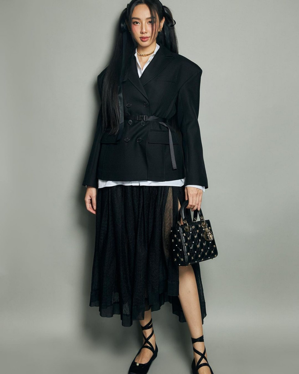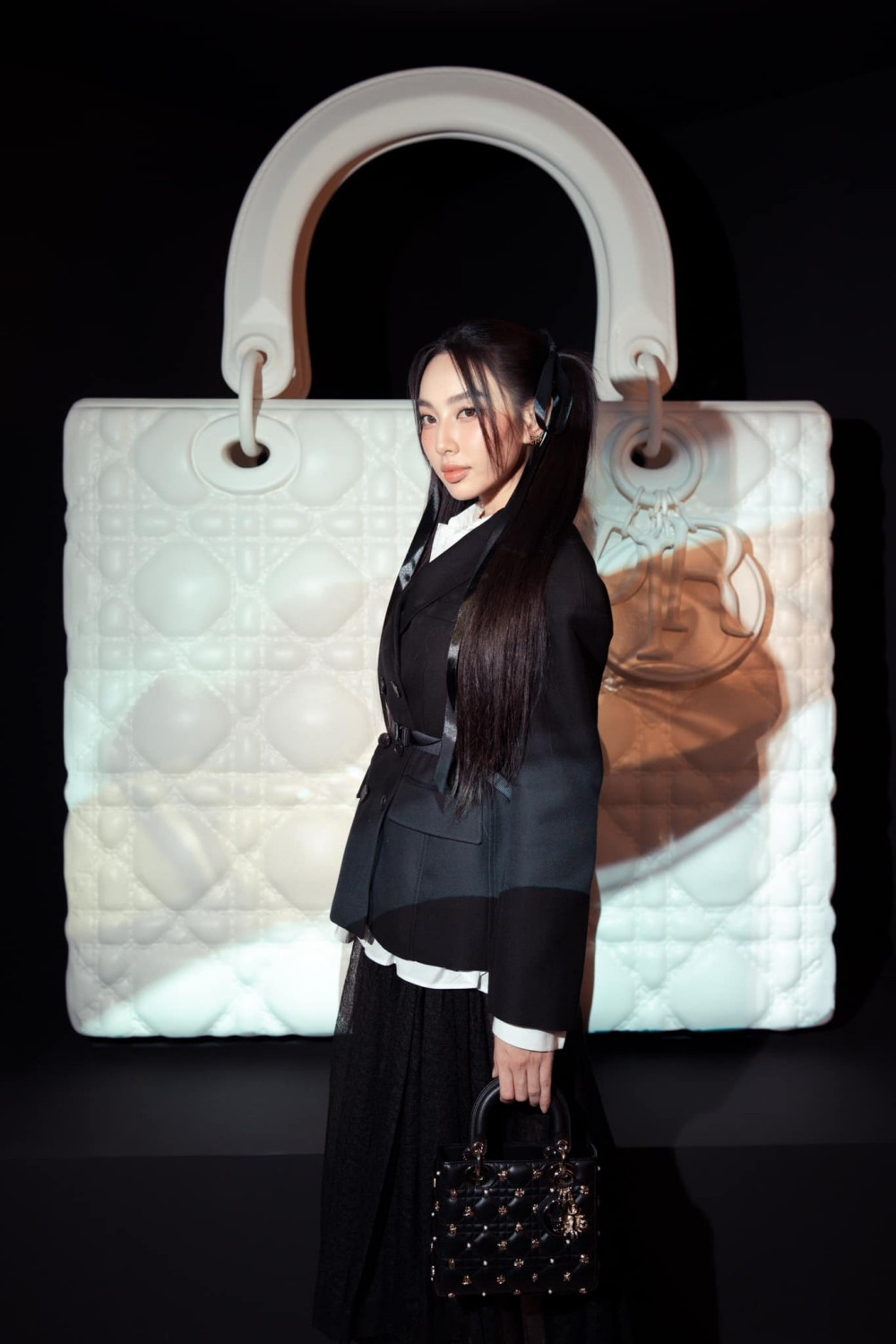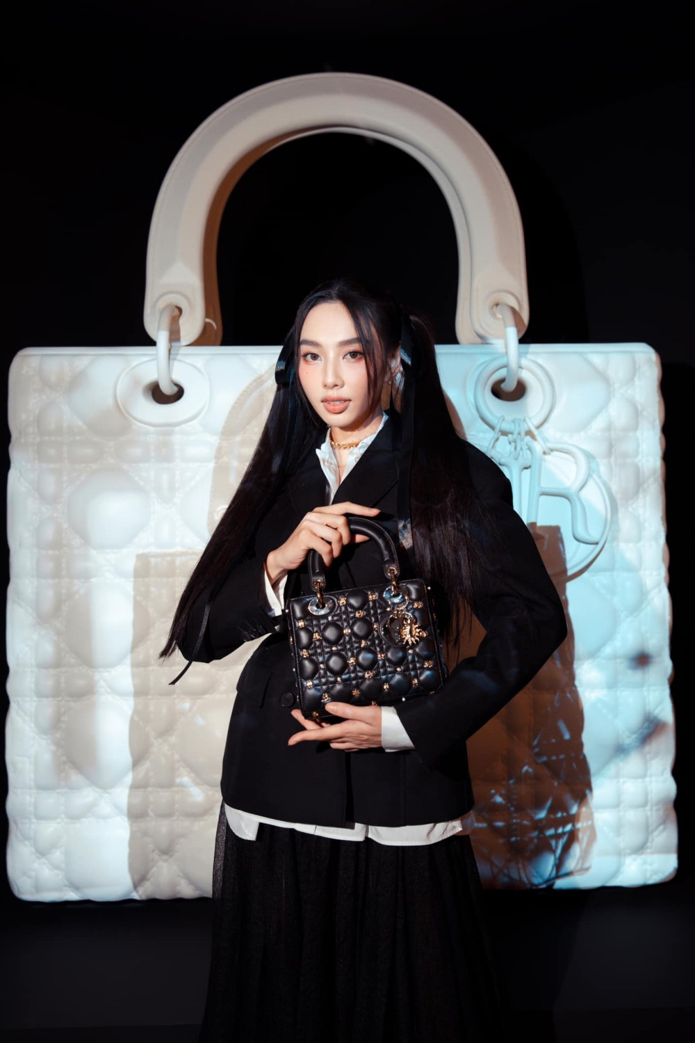 Là khách mời trong một sự kiện mới đây, Miss Grand International 2021 Nguyễn Thúc Thùy Tiên chọn cách mix & match đồ đen - trắng với màu đen là chủ đạo.