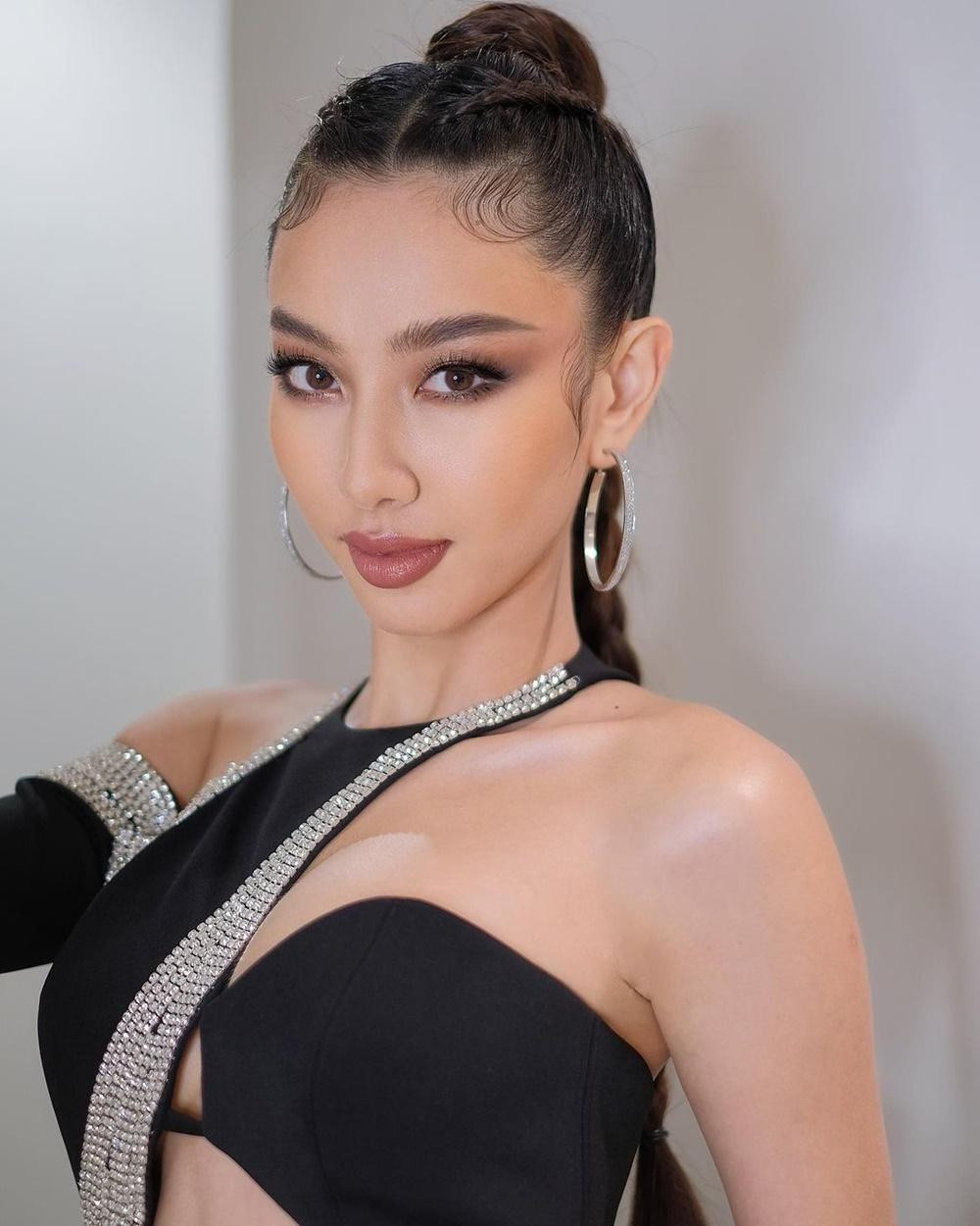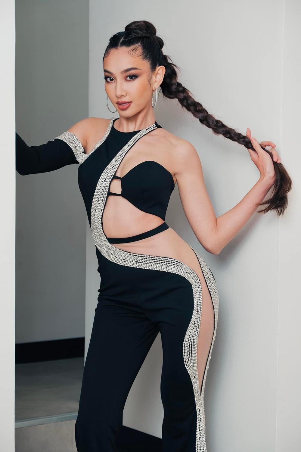 Đầu tiên là set đồ màu đen liền thân được người đẹp diện trong đêm concert trước thềm Bán kết, đây là một thiết kế của NTK Tăng Thành Công. Set đồ với những đường cut-out tạo nên sự bất đối xứng lạ mắt, các đường cong uốn lượn mềm mại từ trên cổ qua thân xuống hông rồi xuống tận gót chân, khoe trọn thân hình siêu chuẩn với vòng eo nhỏ của Hoa hậu Thùy Tiên.