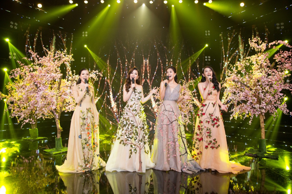 Với nhan sắc rực rỡ, Tiểu Vy, Thùy Tiên, Diễm Trang và Thúy Vi đã đưa khán giả vào một không gian tươi mới với sắc hoa và âm nhạc chuẩn bị chào đón thời khắc đầu tiên của năm mới.