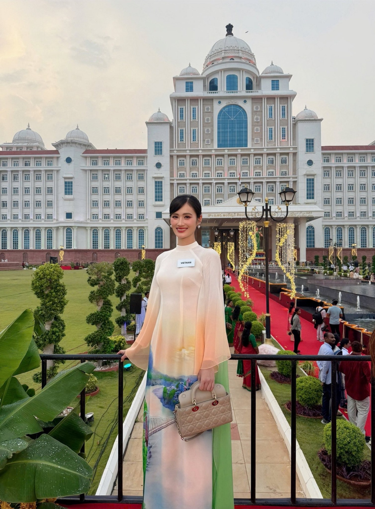 Tham gia hoạt động city tours tại Telangana trong khuôn khổ Miss World 2025, Hoa hậu Ý Nhi lựa chọn chiếc áo dài mà NTK Trung Đinh đã tâm huyết thực hiện riêng cho cô.