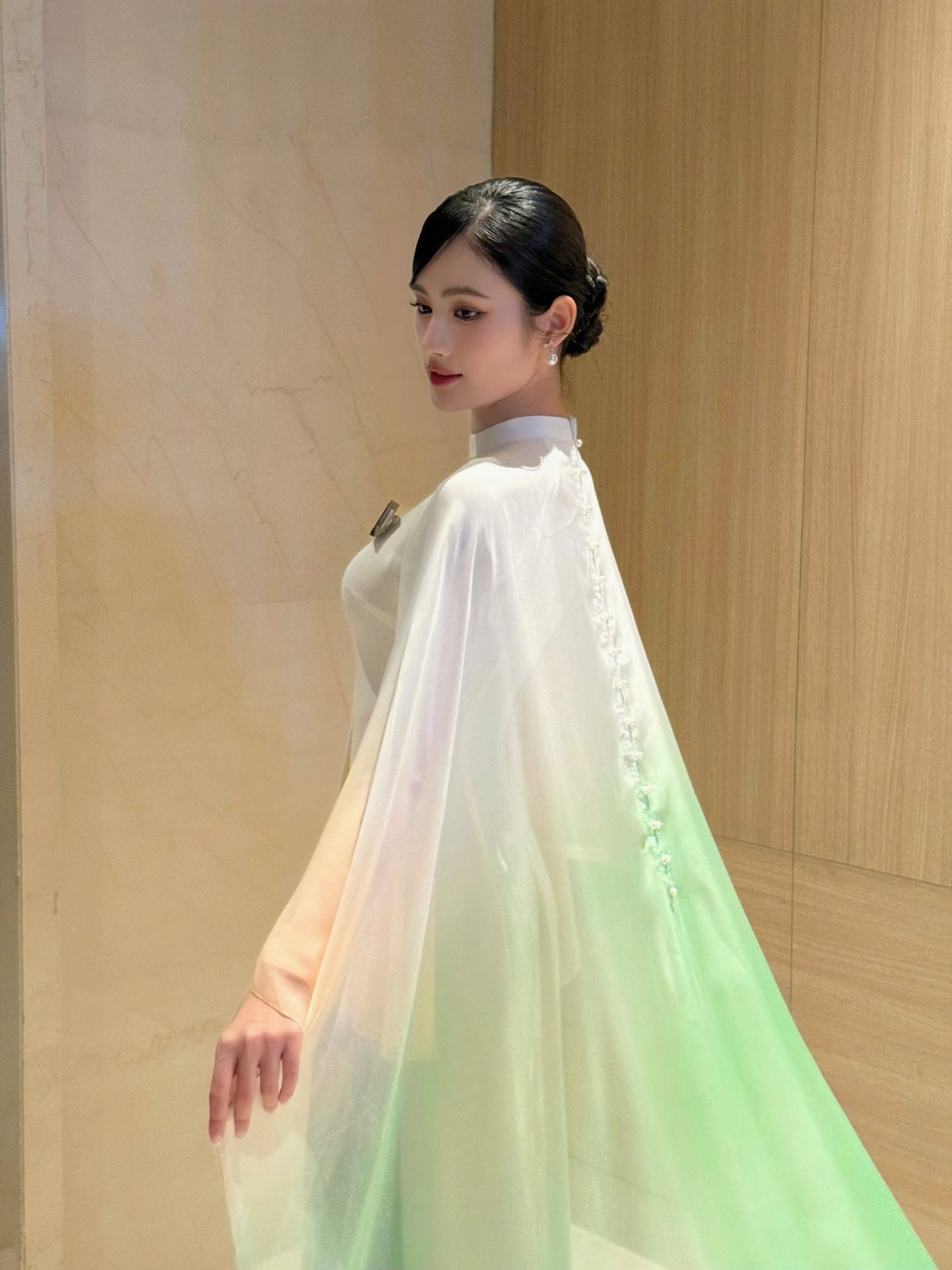 Sự kết hợp hài hoà giữa các gam màu xanh lá, trắng và cam không chỉ tạo nên vẻ nhẹ nhàng, thanh lịch mà còn là sự liên kết ý nhị với màu sắc trên quốc kỳ Ấn Độ. Bên cạnh tôn vinh vẻ đẹp của địa danh nổi tiếng tại Ấn Độ, chiếc áo dài còn thể hiện sự giao thoa văn hóa sâu sắc giữa hai quốc gia, đồng thời gửi gắm sự trân trọng và tình cảm của Ý Nhi cũng như NTK Trung Đinh đối với đất nước, con người nơi đây.