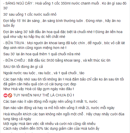 Ngoài ra, Hòa Minzy còn đưa ra thêm lời khuyên: "Các bạn nào ít vận động mỗi ngày nên uống ít nhất 1L nước. Bạn nào vận động và hay ra mồ hôi nên uống ít nhất 2 lít nước mỗi ngày. Hoà khuyến khích các bạn không nên ngồi một chỗ. Hãy chạy nhảy cười đùa tung tăng cả ngày. Một ngày Hoà làm việc rất nhiều và cười nói cũng rất nhiều. Cách này chiếm đến 50% tác dụng giảm cân của Hoà luôn ấy". Và tất nhiên cô nàng không quên "lầy lội" như thường lệ: "Muốn giảm cân nhanh thì có người yêu nữa là nhanh nhất nhé!".