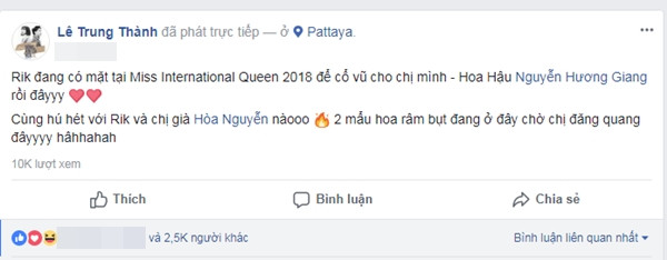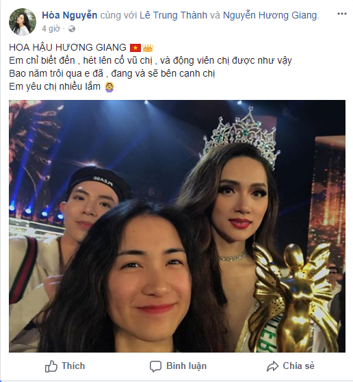 Ngay sau đó Hòa Minzy đã chia sẻ hình ảnh chụp chung với Hương Giang khoảnh khắc đăng quang trên trang cá nhân kèm trạng thái "Em chỉ biết đến, hét lên cổ vũ chị, và động viên chị được như vậy. Bao năm trôi qua em đã, đang và sẽ bên cạnh chị. Em yêu chị nhiều lắm".