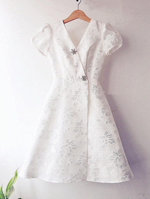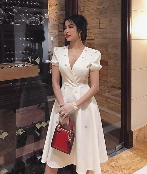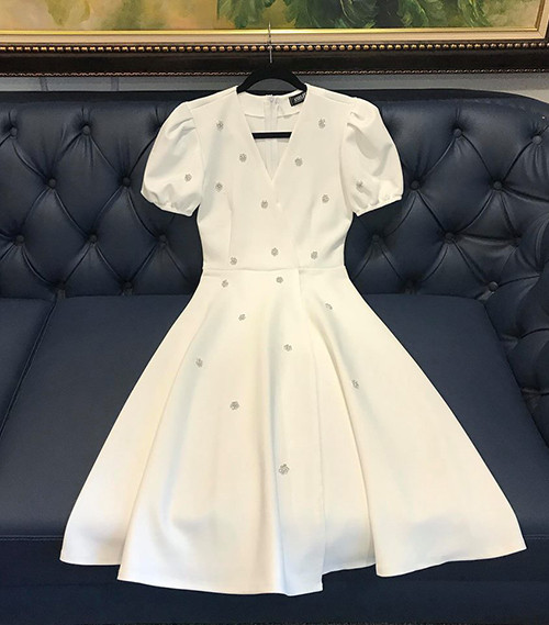 Đặc trưng của kiểu váy này là dáng xòe nhẹ, tay bồng, cổ tim và đính đá lấp lánh, giúp người mặc trở nên rất yêu kiều.