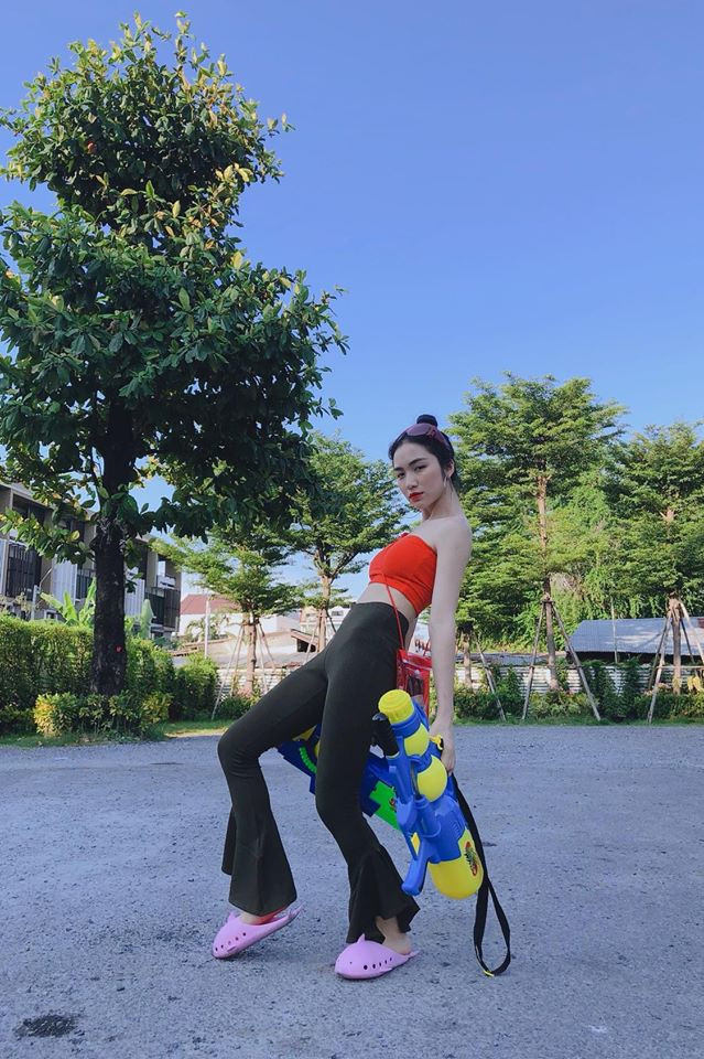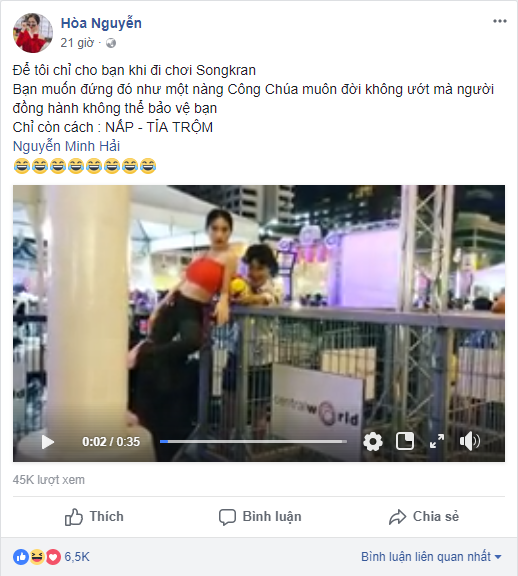 Đặc biệt, bên cạnh những bức hình “quẩy” cực sung cùng tạo hình "lầy" thường thấy, cô nàng còn đăng tải clip có mặt bạn trai Minh Hải và tag thẳng tên. "Để tôi chỉ cho bạn khi đi chơi Songkran. Bạn muốn đứng đó như một nàng Công Chúa muôn đời không ướt mà người đồng hành không thể bảo vệ bạn".