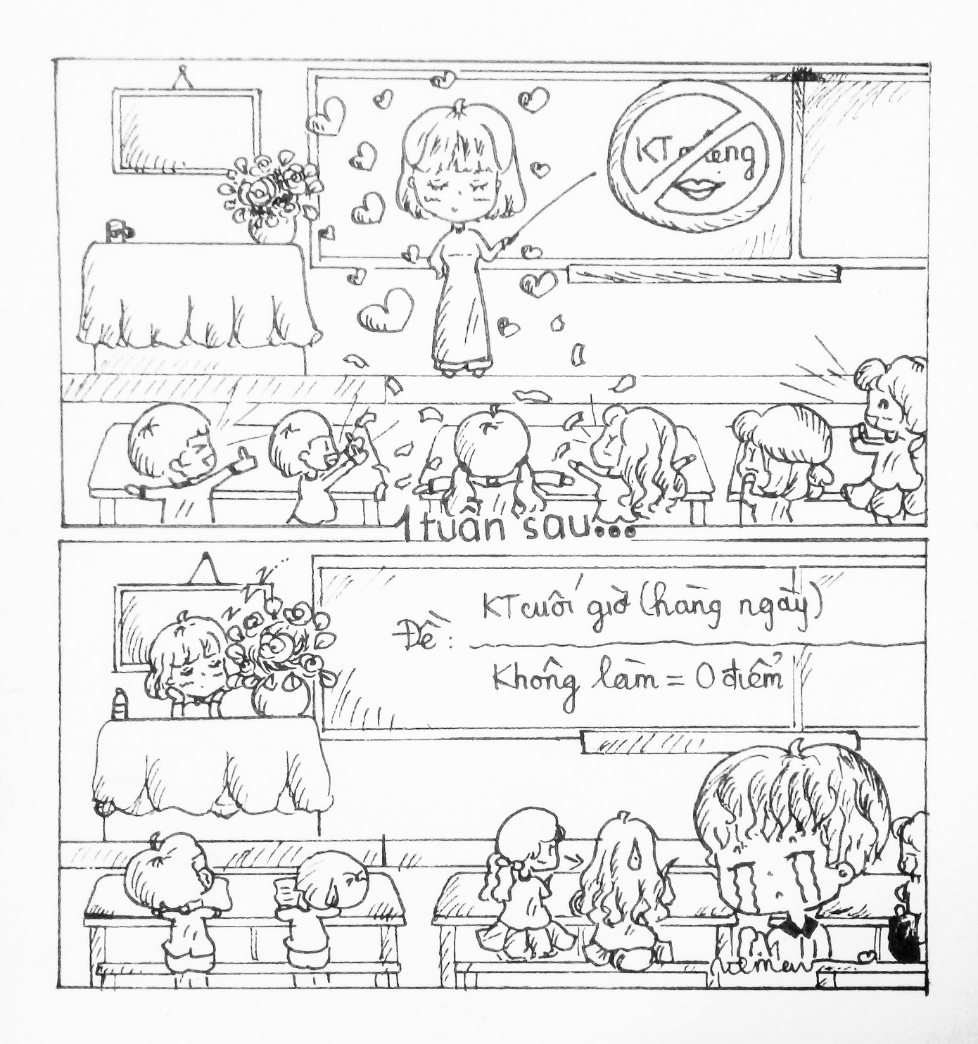 2. Đầu năm cô nói với tụi tui cô là người không thích ép buộc học sinh, không thích bắt học sinh trả bài miệng, tội học sinh. Một tuần sau, mỗi ngày tụi tui đều phải làm một bài kiểm tra cuối giờ, không hề mỏi miệng, ai muốn làm thì làm, không làm thì không điểm.