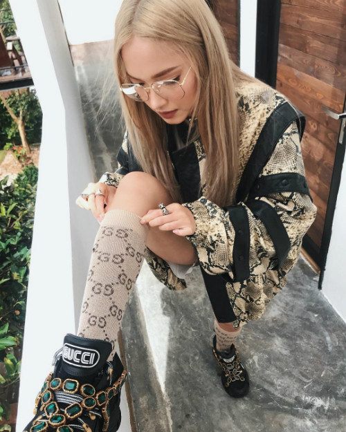 Sao Việt cũng không nằm ngoài xu hướng này. Huyền Baby trẻ trung, sang chảnh khi phối chân váy họa tiết da trăn cùng áo sơ mi trắng.