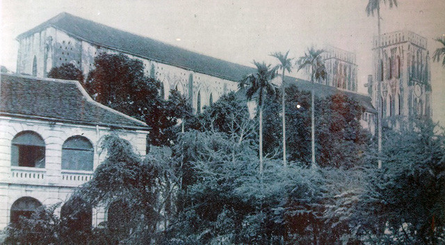 Một góc Nhà thờ lớn Hà Nội. Nhà thờ Lớn Hà Nội được xây dựng trên một phần đất của chùa Báo Thiên xưa - ngôi chùa có niên đại xây dựng nhất sớm, thời Vua Lý Thánh Tông năm 1057. Nhà thờ lớn Hà Nội cũng là công trình nổi tiếng được xây dựng rất nhanh, 4 năm đã hoàn thành (1884-1887). Người có công xây dựng nhà thờ là Giám mục Puginier (1835-1892). Nhà thờ được xây dựng bằng các nguyên liệu sẵn có trong nước như gạch nung và trát bằng giấy bổi, một số nguyên liệu quan trọng được đưa từ bên Pháp sang như hệ thống kính màu, các quả chuông, tượng thánh. Nhà thờ lớn là công trình được xây dựng phỏng theo kiến trúc Nhà thờ Đức Bà Paris ở nước Pháp.