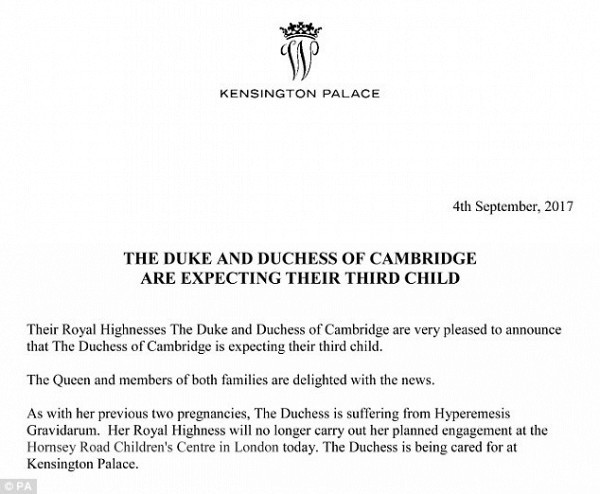 Theo thông cáo: “Cũng như hai lần mang thai trước, nữ Công tước đã bị ốm nghén nặng. Cô sẽ không tiếp tục thực hiện các kế hoạch tại Trung tâm trẻ em Hornsey Road ở London trong ngày hôm nay. Hiện nữ Công tước đang được chăm sóc tại điện Kensington.”
