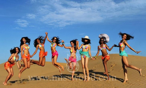 Hôm 31-7, Hoàng My (phải) và 120 người đẹp đại diện cho các quốc gia và vùng lãnh thổ tham dự Hoa hậu Thế giới 2012 có phần ghi hình với trang phục bikini tại sa mạc Nội Mông, Trung Quốc.