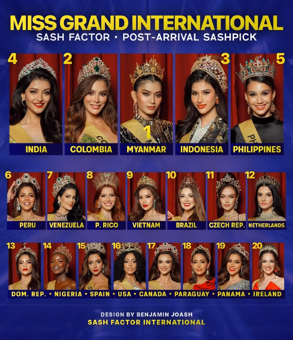 BXH về sự thể hiện của dàn thí sinh sau những ngày đầu nhập cuộc Miss Grand International 2023, Hoàng Phương được xếp thứ 9.