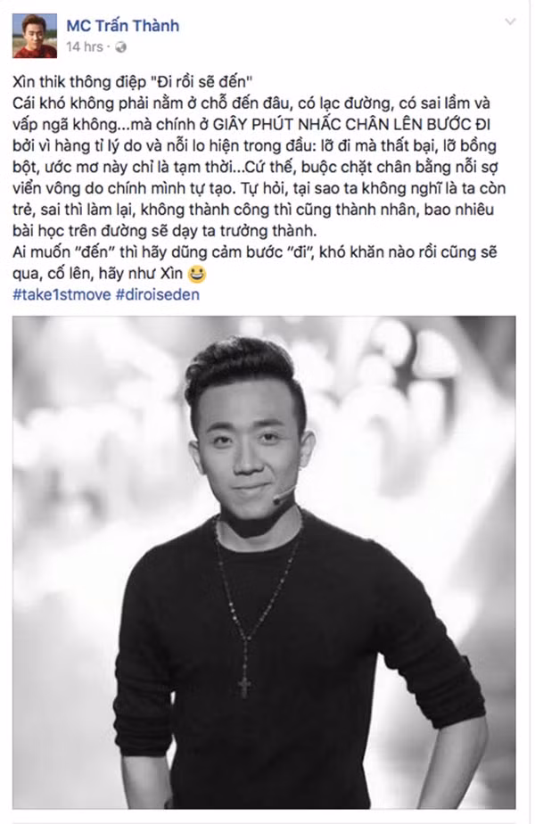 Trên fanpage cá nhân với hơn 11 triệu người theo dõi, MC Trấn Thành vừa đăng dòng trạng thái bày tỏ sự thích thú với thông điệp “Đi rồi sẽ đến” của Sơn Tùng M-TP. “Xìn (biệt danh của Trấn Thành- pv) thích thông điệp "Đi rồi sẽ đến". Cái khó không phải nằm ở chỗ đến đâu, có lạc đường, có sai lầm và vấp ngã không mà chính là ở GIÂY PHÚT NHẤC CHÂN LÊN BƯỚC ĐI bởi vì hàng tỉ lý do và nỗi lo hiện trong đầu: lỡ đi mà thất bại, lỡ bồng bột, ước mơ này chỉ là tạm thời...Cứ thế, buộc chặt chân bằng nỗi sợ viển vông do chính mình tự tạo. Tự hỏi, tại sao ta không nghĩ là ta còn trẻ, sai thì làm lại, không thành công thì cũng thành nhân, bao nhiêu bài học trên đường sẽ dạy ta trưởng thành.Ai muốn “đến” thì hãy dũng cảm bước “đi”, khó khăn nào rồi cũng sẽ qua, cố lên, hãy như Xìn. #take1stmove #diroiseden”.