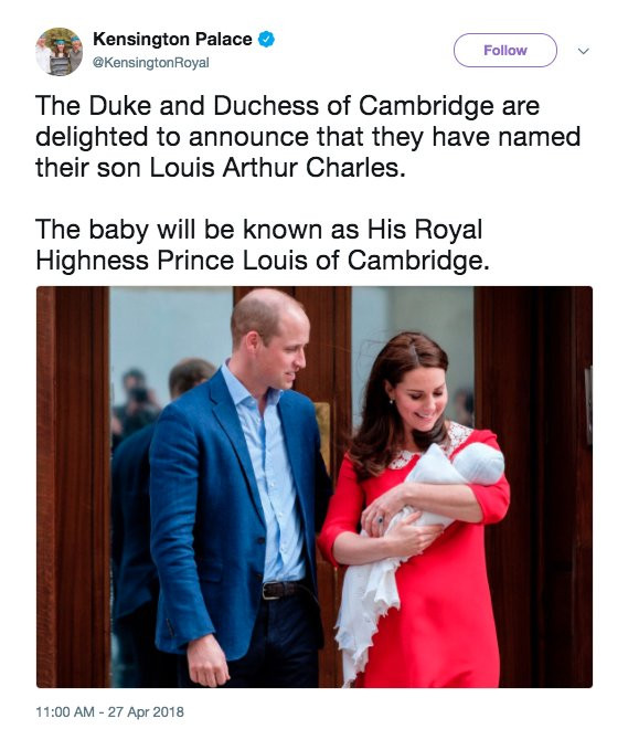 Thông báo về tên gọi của hoàng tử bé nước Anh được phát đi tại trang Twitter và Instagram chính thức của Cung điện hoàng gia Kensington vào 17h ngày 27/4. Theo đó, Hoàng tử William và Công nương Kate quyết định người con thứ 3 của mình tên là Louis Arthur Charles. Cậu bé sẽ được biết đến là Hoàng tử Louis xứ Cambridge.