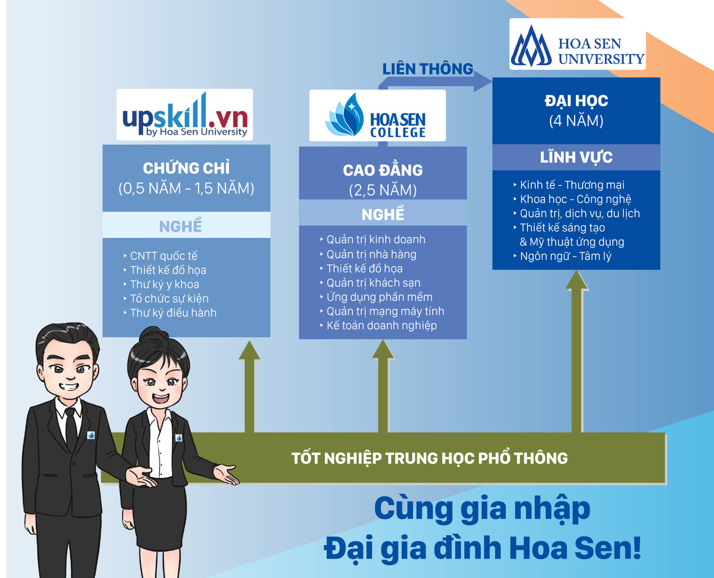 Sinh viên tốt nghiệp bậc Cao đẳng có thể liên thông lên các bậc học cao hơn tại các trường Đại học trong và ngoài nước. Đơn cử, sinh viên Cao đẳng Hoa Sen có thể tiếp tục theo học các chuyên ngành được đào tạo tại Đại học Hoa Sen với thời gian đào tạo từ 1 đến 1,5 năm.