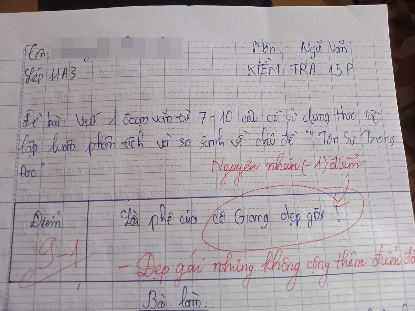 Cụ thể, cậu bạn này cũng hào hứng sửa ô "Lời phê của thầy cô giáo" thành "Lời phê của cô Giang đẹp gái" trong bài kiểm tra môn Văn với hi vọng nhận được ưu ái trong quá trình chấm điểm.