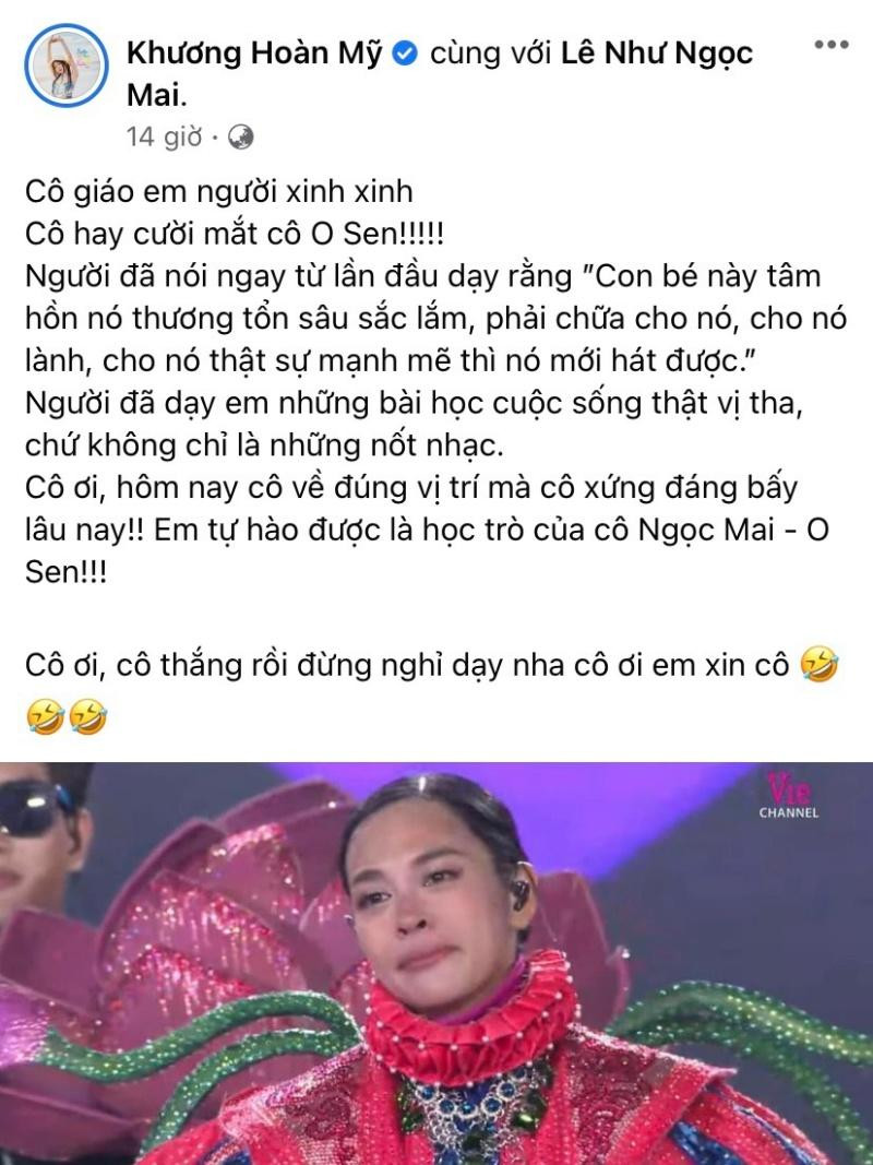 Ngay trong đêm Thạc sĩ - ca sĩ Ngọc Mai trở thành Quán quân The Masked Singer Vietnam, Orange đã xúc động chia sẻ: "Cô giáo em người xinh xinh. Cô hay cười mắt cô O Sen! Người đã nói ngay từ lần đầu dạy rằng: "Con bé này tâm hồn nó thương tổn sâu sắc lắm, phải chữa cho nó, cho nó lành, cho nó thật sự mạnh mẽ thì nó mới hát được". Người đã dạy em những bài học cuộc sống thật vị tha, chứ không chỉ là những nốt nhạc. Cô ơi, hôm nay cô về đúng vị trí mà cô xứng đáng bấy lâu nay! Em tự hào được là học trò của cô Ngọc Mai - O Sen! Cô ơi, cô thắng rồi đừng nghỉ dạy nha, cô ơi em xin cô".
