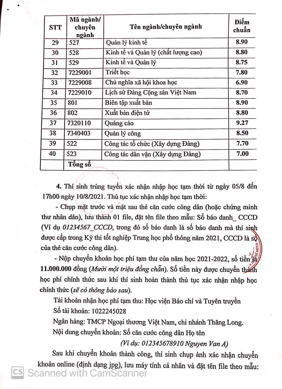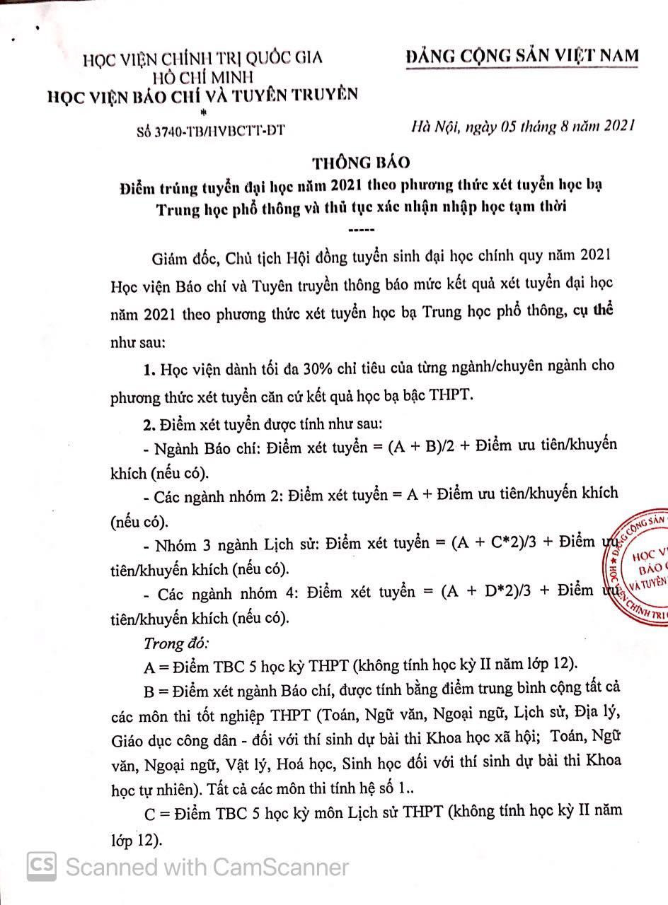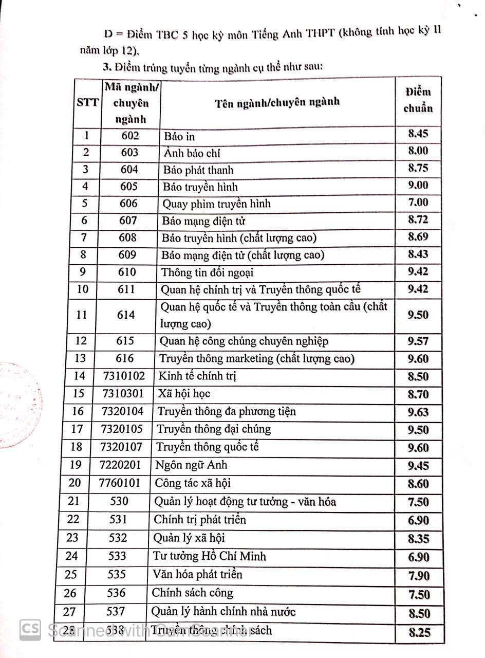 Năm nay, Học viện Báo chí và Tuyên truyền dành tối đa 30% chỉ tiêu của từng ngành/ chuyên ngành cho phương thức xét tuyển căn cứ vào kết quả học bạ bậc THPT. Điểm trúng tuyển từng ngành cụ thể như sau: