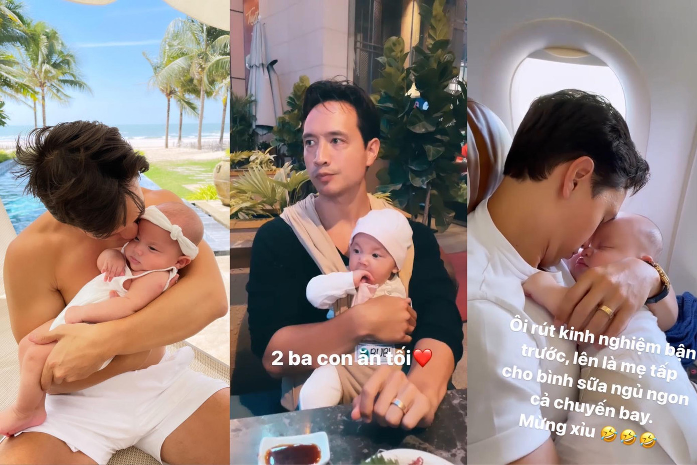 Không chỉ vậy, trong các chuyến du lịch, ông bố Kim Lý luôn tranh phần bế và trông con với vợ. Nhiều hình ảnh được Hồ Ngọc Hà đăng tải cho thấy chồng của nữ ca sĩ dù vui chơi du lịch nhưng cũng không quên việc chăm con.