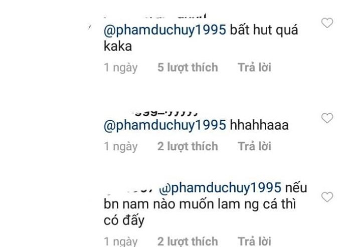 Chuyện là mới đây, Đức Huy hào hứng khoe với fan hình ảnh mình đi lặn trên Instagram và còn hài hước tự nhận mình là... người cá. Bức ảnh này của anh chàng đã thu hút rất nhiều lượt "thả tim" và bình luận nhận xét về chàng người cá. Tranh thủ độ hot của bài đăng, một shop bán quần áo online đã comment quảng cáo shop của mình ngay dưới bài đăng của Đức Huy, và đương nhiên là "quàng tử" chẳng chịu để yên. Anh chàng đã trả lời quảng cáo của shop bằng một comment rất trực diện nhưng không kém phần tinh tế: "Bán váy cho nam không?".