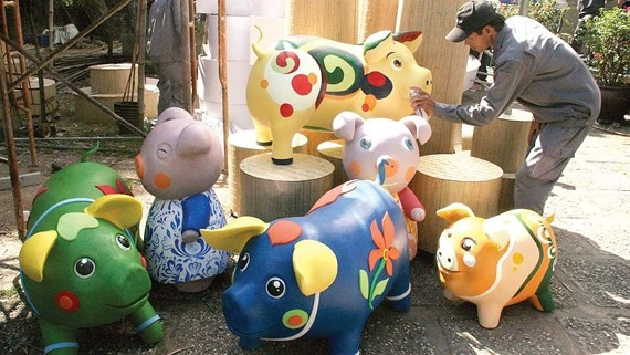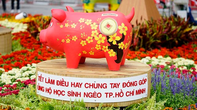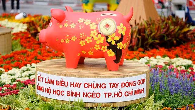 Sự xuất hiện của chú heo đỏ trên lưng mang họa tiết mai vàng và biểu tượng đồng tiền với tên gọi thân thương: "Nuôi heo đất, Tết làm điều hay, chung tay đóng góp cho học sinh nghèo TP.HCM.