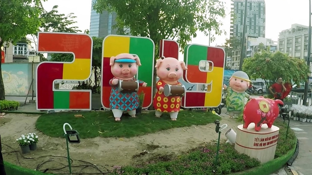 Hai cụm linh vật ở hai bên cổng Đường hoa, mỗi cụm với 3 chú heo cùng với bảy chú heo cổng chính, tất cả đều mặc trang phục áo dài nhiều màu sắc, họa tiết xinh xắn phối với nón lá, khăn rằn, mũ lưỡi trai hoặc băng đô. Linh vật được thiết kế, tô vẽ màu sắc vui vẻ, ánh mắt cười đùa, chú thì cầm bánh, chú ôm đèn, chơi đàn thể hiện đặc trưng của linh vật Hợi ở tinh thần lạc quan và yêu đời.
