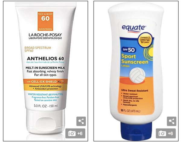 Hãy mua: Mặc dù có mức giá khác nhau, tuýp kem chống nắng Anthelios (trái) trị giá 36 đô la và sản phẩm Equate giá 5 đô la của Walmart (phải) đứng đầu bảng xếp hạng Consumer Reports 2018.