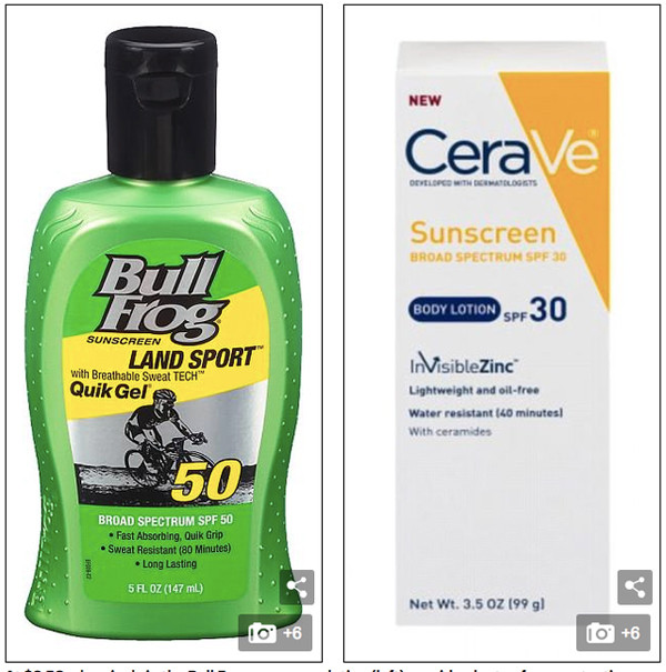 Với giá 8,5 đô la, hóa chất trong lotion chống nắng Bull Frog (trái) có tác dụng bảo vệ chống nắng khá tốt, trong khi lotion kẽm của CeraVe (bên phải) đã không vượt qua được các kiểm nghiệm của Consumer Reports