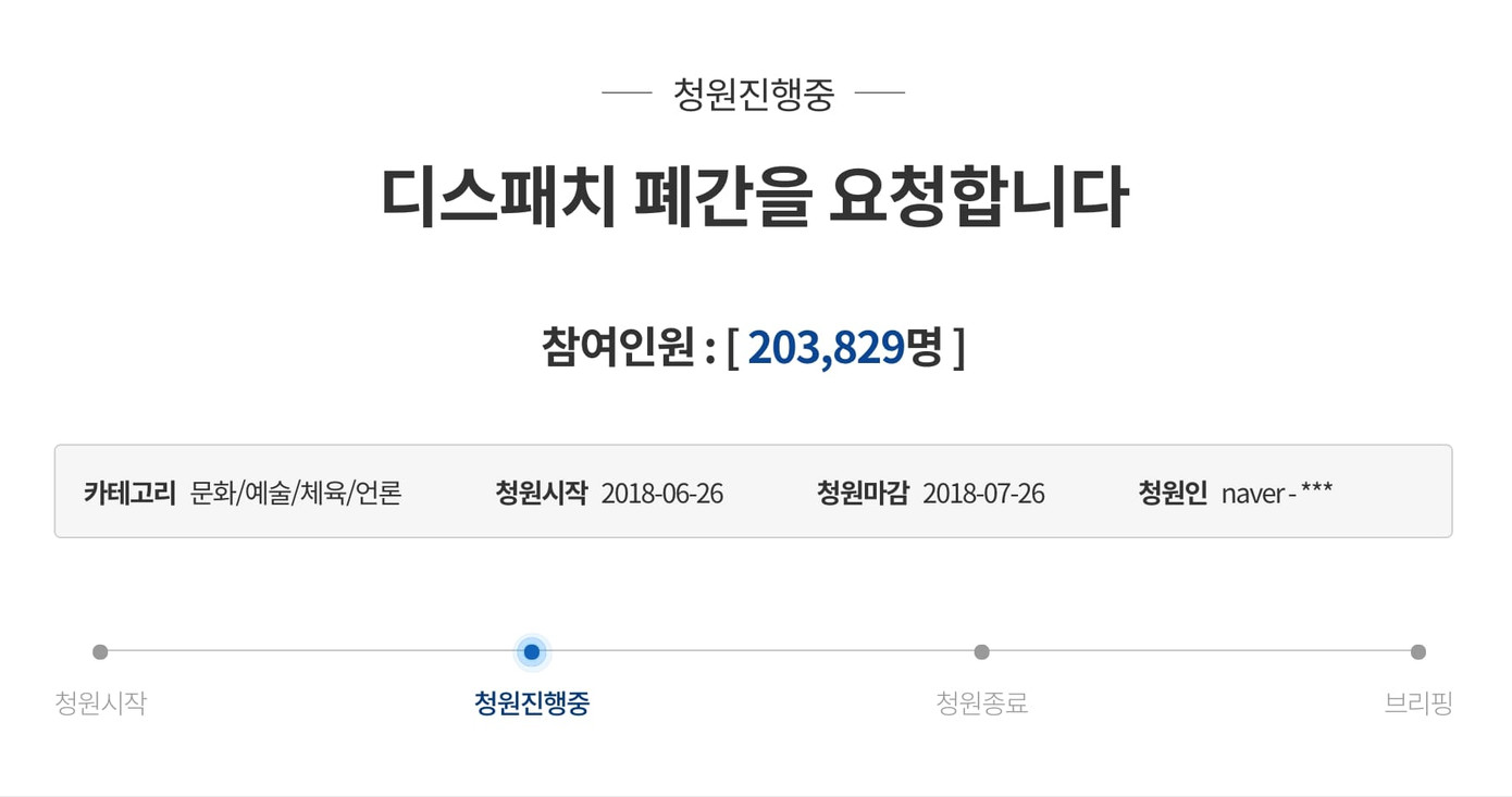 Với những hành vi xúc phạm đời tư nghệ sĩ, người dân Hàn Quốc đã đệ đơn lên gửi đến Nhà Xanh bản kiến nghị yêu cầu đình chỉ trang báo Dispatch từ ngày 26/6. Theo đúng luật pháp của nước này, nếu trong vòng 30 ngày lá đơn gom đủ 200.000 chữ ký, phía Nhà Xanh sẽ chính thức vào cuộc, nghiêm túc xem xét kiến nghị từ người dân. Kết quả lá đơn này chỉ mất ba tuần để đạt yêu cầu, chứng minh rằng công chúng đang rất phẫn nộ với hành vi của Dispatch.