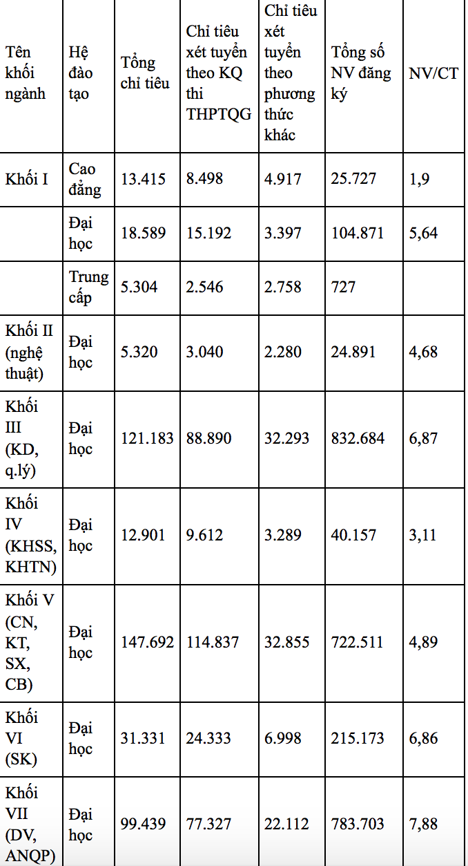 Khối ngành Kinh doanh, Quản lý nhận có nhiều nguyện vọng đăng ký nhất – 832.684 nguyện vọng (NV), trong đó chỉ tiêu là 121.183 chỉ tiêu.