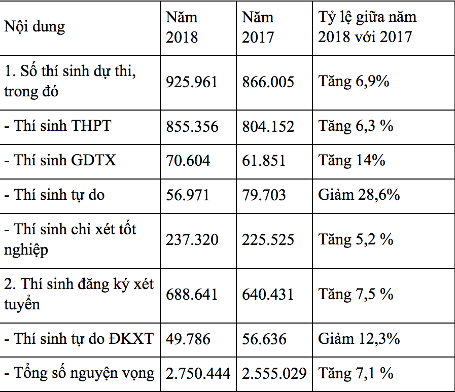 Theo Bộ GD&ĐT, năm 2018, chỉ có số thí sinh tự do đăng ký xét tuyển giảm, còn số thí sinh THPT, thí sinh GDTX và thí sinh thi chỉ để xét tốt nghiệp đều tăng.